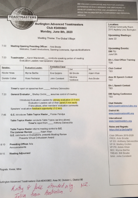 While some of their club members were absent, Toastmasters from Australia and New Zealand, and a couple of other countries, joined in. The theme for the meeting was “A Global Village” and it sure felt like that with such a range of participants.