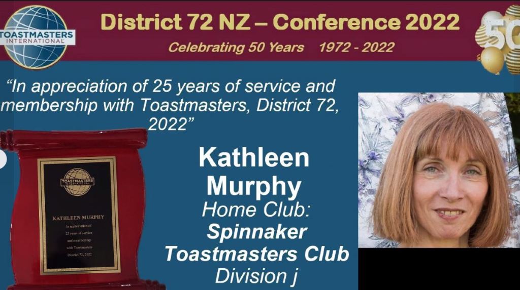 Today Kathy was awarded her 25 year plaque at the District 72 Toastmasters Online Convention. This means Kathy has been a member of Toastmasters for 25 years, a marvelous achievement. In this time Kathy has performed many meeting and leadership roles, including President, VP Education, and achieved her Advanced Communicator Gold and Advanced Leader Bronze awards under the legacy educational programme.