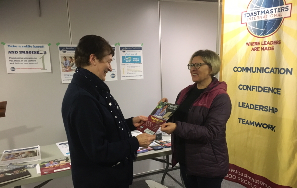 We’ll offer everyone a mintie or lollipop, and draw their attention to our resources table, and our videos. We’ll talk to them about the benefits of joining Spinnaker Toastmasters Club to build or enhance their public speaking and leadership skills.