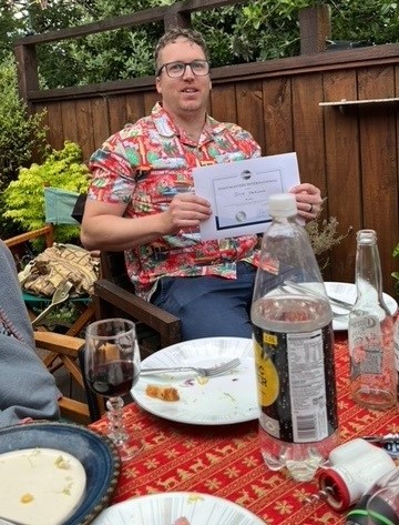 A small but perfectly formed group of Spinnaker club members gathered for a Christmas BBQ on Tuesday 6th December. Ron and Jacqui very kindly opened their home to us and so we followed the time-honored Kiwi tradition and brought a plate. Some of us were even adorned with Christmas decorations and antlers. The Santa tie and shirt were suitably admired. We ate heartily, enjoyed each other’s company and had good fun with a round of table topics. Dave’s an expert at trifle and spent some time preparing and assembling his masterpiece.