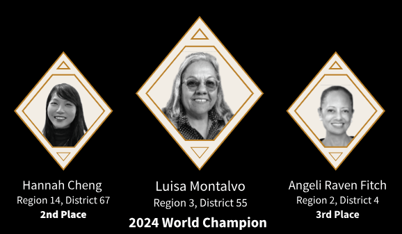Luisa Montalvo is the new World Champion of Public Speaking! Luisa from District 55 won with a speech titled “37 Strangers.” Watch on YouTube.