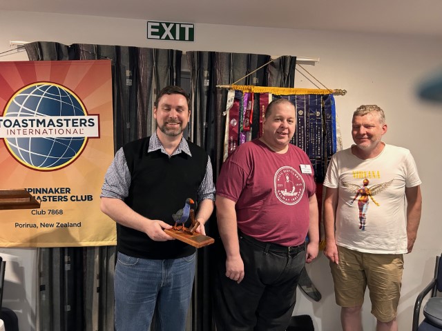 Three members of the Waikanae Toastmasters Club David, Terence and Chris visited Spinnaker on Tuesday 19 November to hand over the Travelling Gavel.