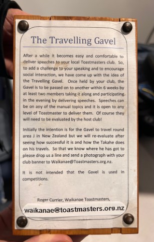 The Travelling Gavel is a carved award that is presented from one club to the next. Two members of the handover club takes the award to the new club and presents a speech and evaluation. The idea is that the award keeps making its way around clubs promoting a sense of participation and joint involvement and fostering fellowship to benefit all members.