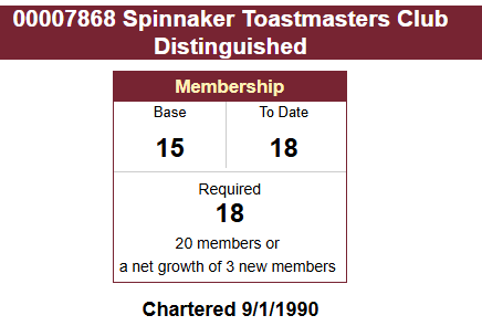 Spinnaker Toastmasters Club has achieved Distinguished Club status in the 2024-25 Toastmasters Year.