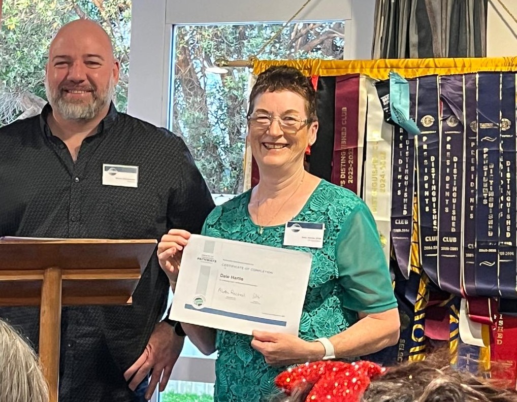 Congratulations to Dale Hartle who has completed all the Level 1 projects in the Visionary Communication Pathway and received her certificate from President Dieter.