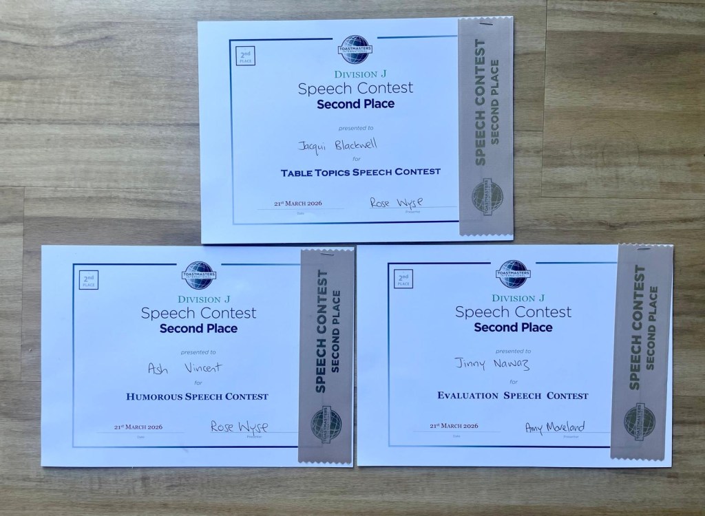 Spinnaker Toastmasters scored a trio of 2nds at the Division Speech Contests held on Saturday 21 March 2026.
