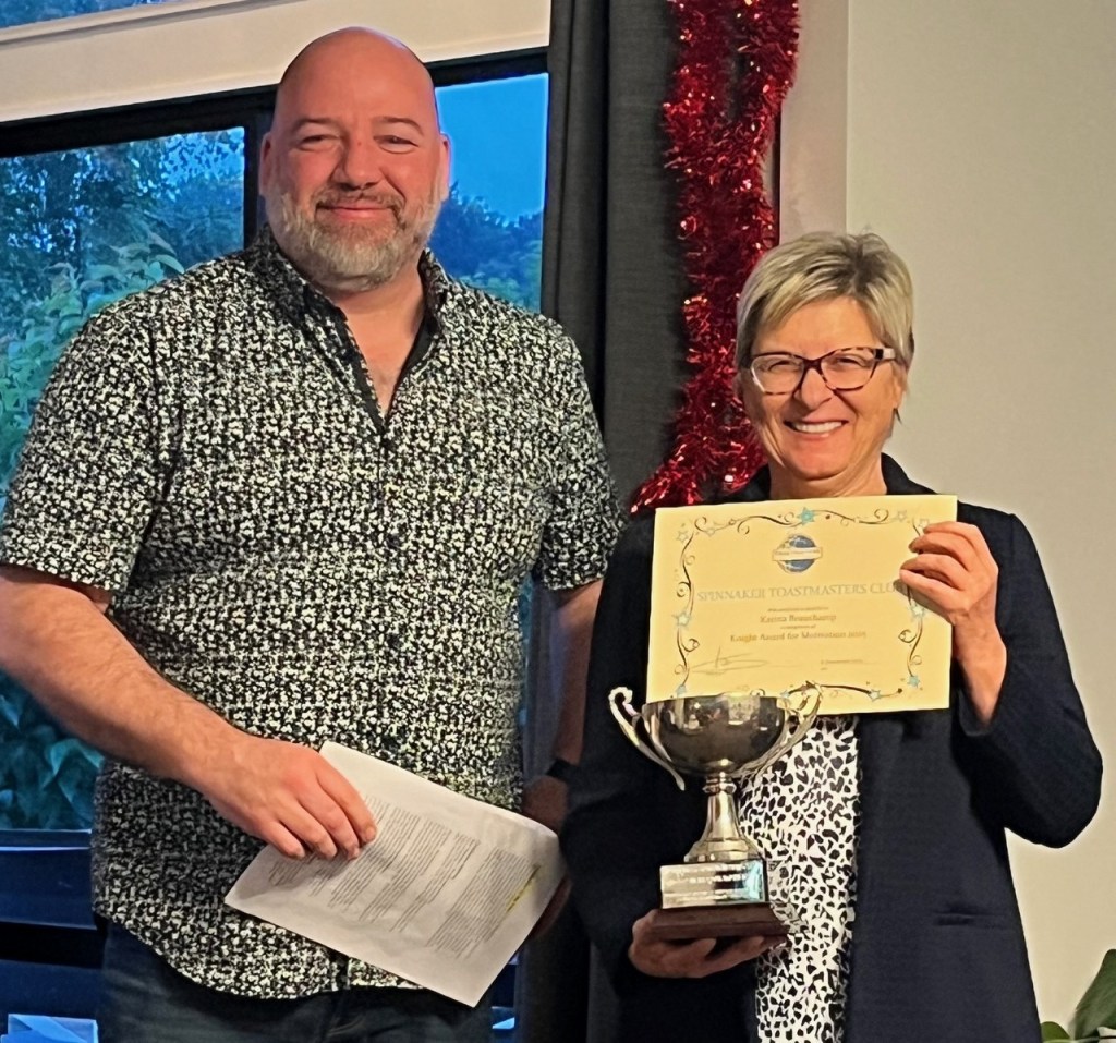 Katina, as club secretary, continues to display outstanding leadership skills in helping to manage the Spinnaker club and the wider Toastmasters community.
