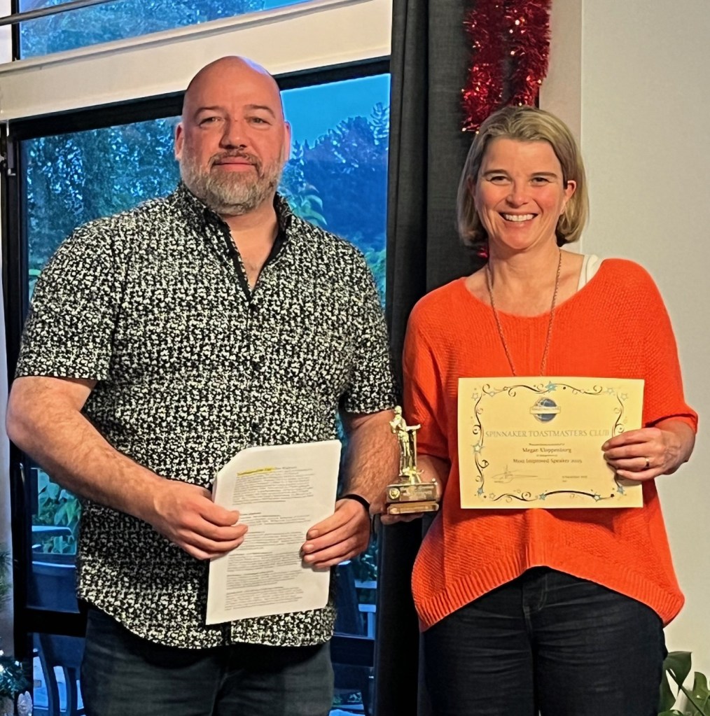 Megan has also chaired Spinnaker meetings, performed the role of table topics mistress twice, has been general evaluator, conducted 4 speaker evaluations, been awarded the best speaker of the night twice and best evaluator. She has completed the Visionary Communication Level 3 Pathway. Our favourite speech by Megan this year was on “communicating change to teenage daughters”.