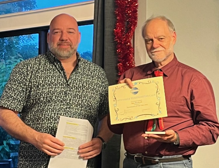 The George Nicholson Award is awarded to a first-time winner of a Prepared Speech Contest, and this year it goes to Ash Vincent. Ash joined Spinnaker on 1 April with the Speechcraft course, and since then has been like a dynamo, attending the District Conference and meeting the International Director, giving speeches and evaluations, and completing the grammarian role with words of the day being “audacity” and “radical”. In his role as Sgt of Arms, Ash is responsible for setting up and packing down our meeting venue, managing our online Zoom presence, organizing the supper supplies and club assets. He attends club officer training, and club executive meetings. Ash won the Spinnaker Humorous speech contest in October, and was top dog at the Area J1 contest last week. Our favourite speech by Ash opened with “Standing in my room, ready to pack my gym bag… and then …”