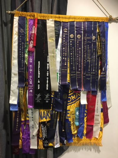 Spinnaker Toastmasters Club flags and banners, our lectern, a TV and two animated club videos (see Blog post 3)