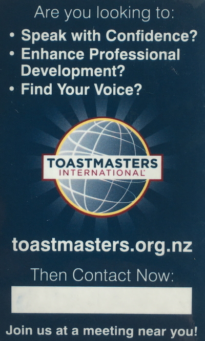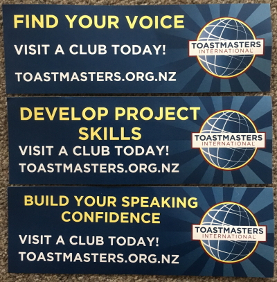 Toastmasters New Zealand branded fridge magnets and pens, minties (for the adults) and lollipops (for the kids).