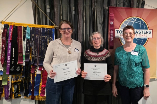 Table Topics: Winner Jacqui (centre), 2nd Angela (left) with Contest Chair Dale