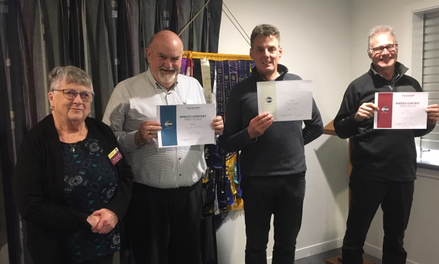 1 September 2020 – Club Table Topics Contest. From left: Area Director Pauline Cook, Darrell (1st place), Dave (2nd place), Peter (3rd place).